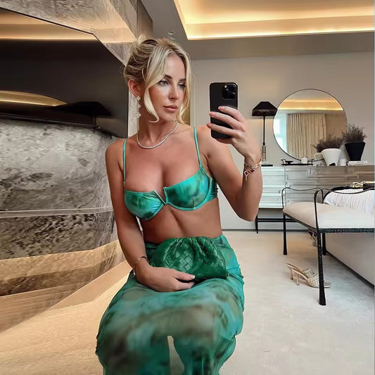 Two piece outfit that appears to be a teal crop top and a maxi skirt with a mermaid-style silhouette and print.