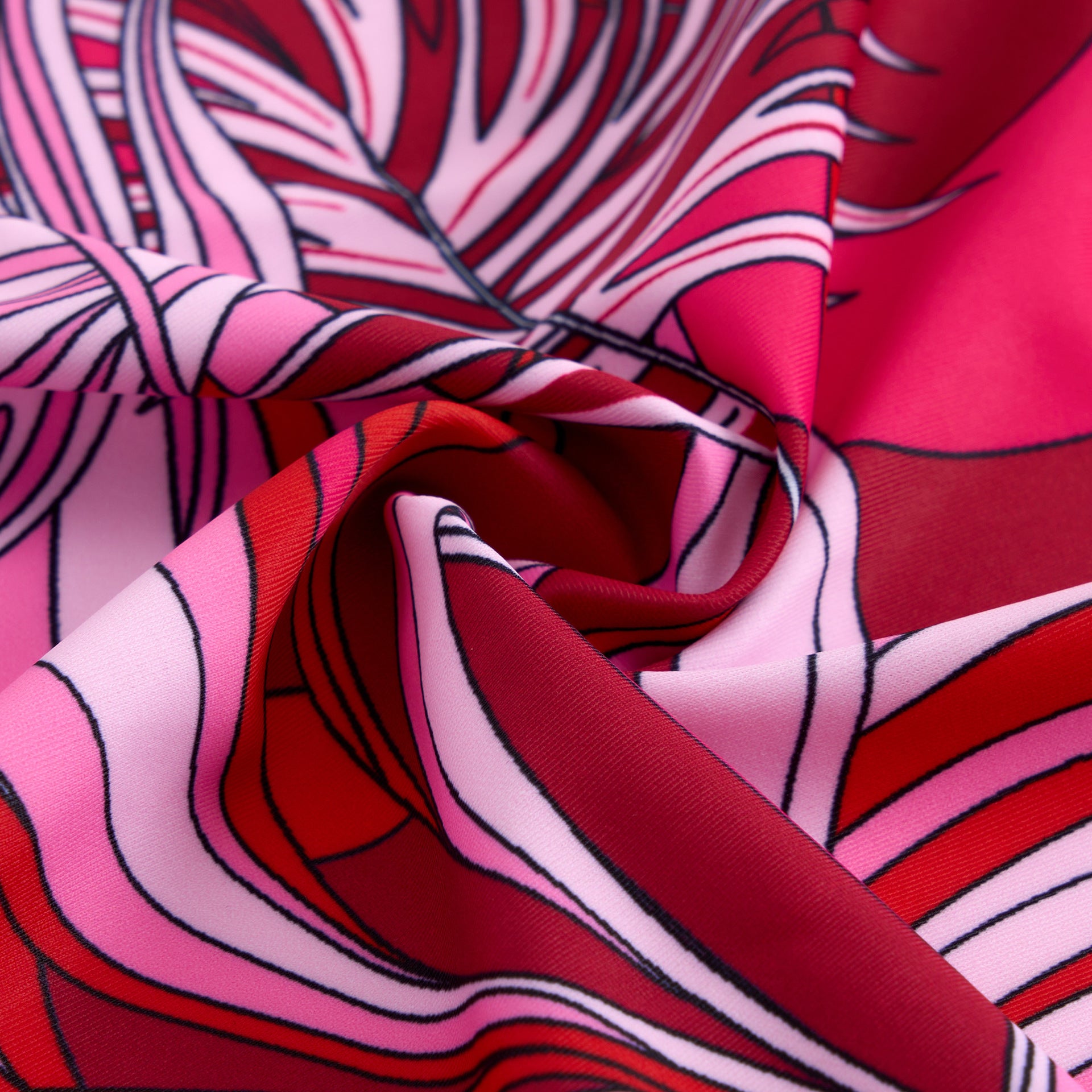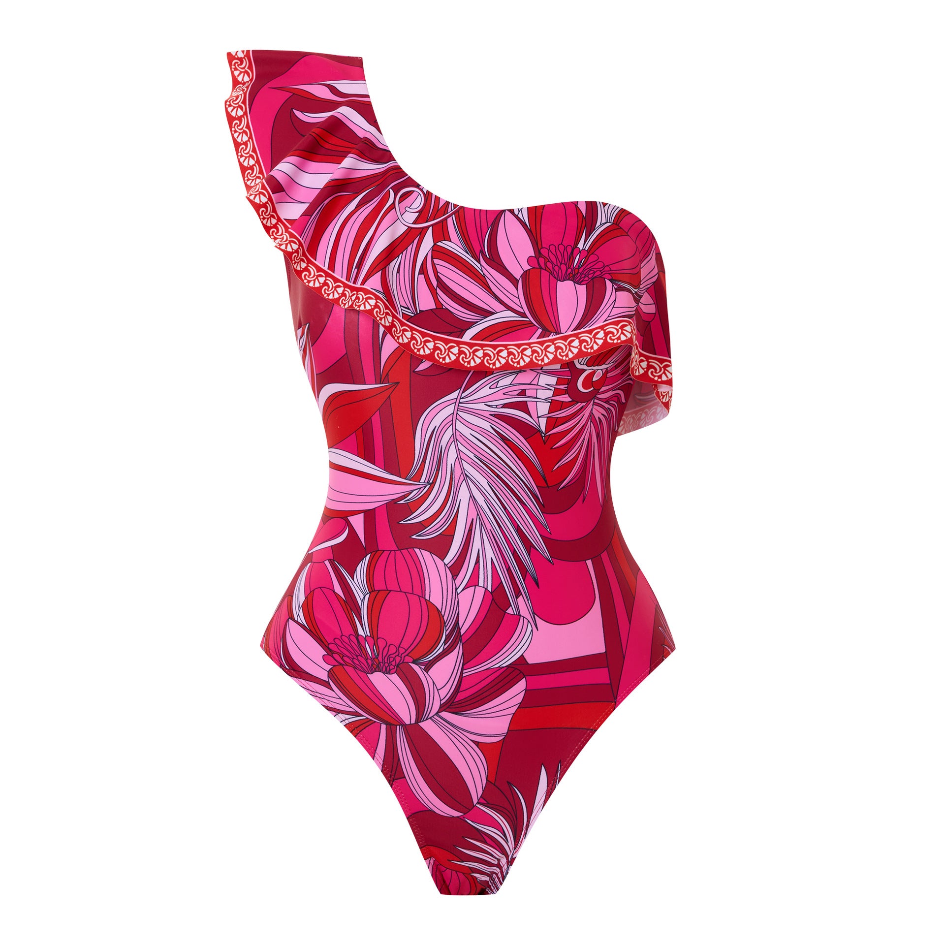 Red one-piece swimsuit with a single ruffled shoulder,paired with a matching short skirt