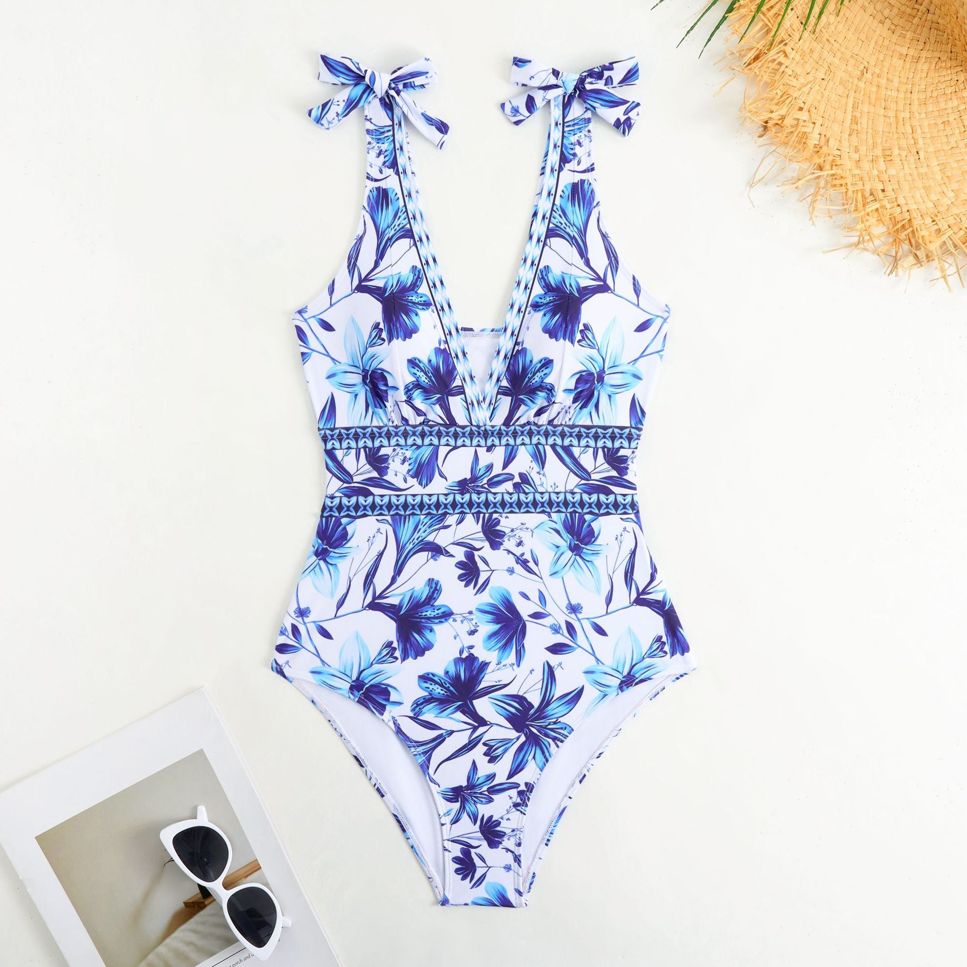 V-neck,blue floral print,swimsuit with a high-wasted sheer skirt